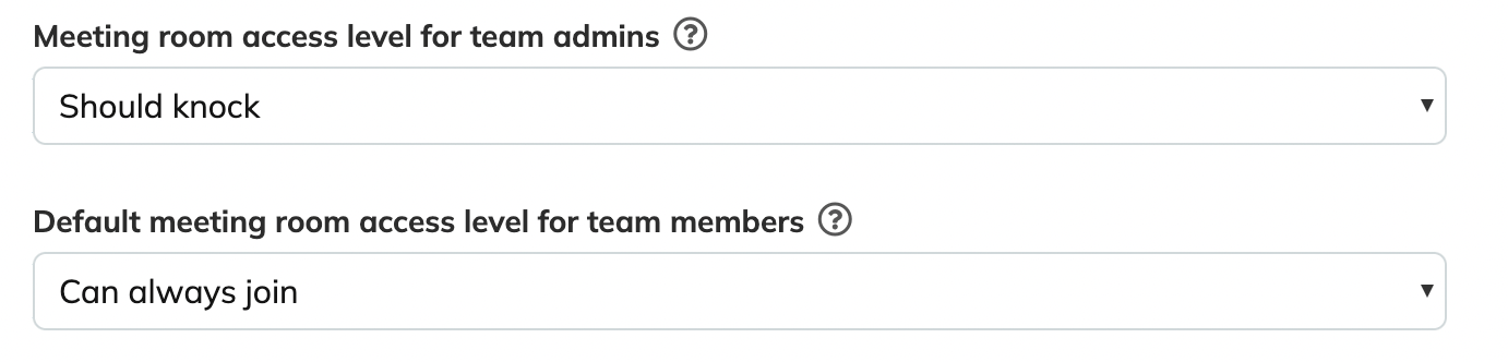 Eg. If the team admin access is 'Should knock' but meeting room access level for team members is 'Can always join', the admins will also have 'Can always join' access.