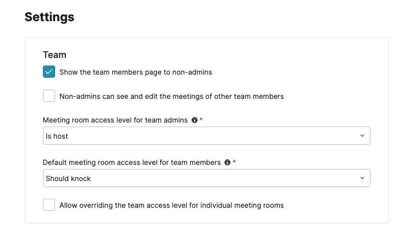 Meeting room access level for team admins: choose the default access that team admins have for team meetings rooms, this option doesn't apply for non-admin team members.
