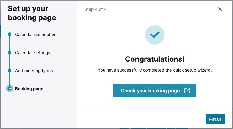 Click on Check your booking page to see what the meeting type(s) look like or click on Finish to finish the setup and edit/add meeting types.