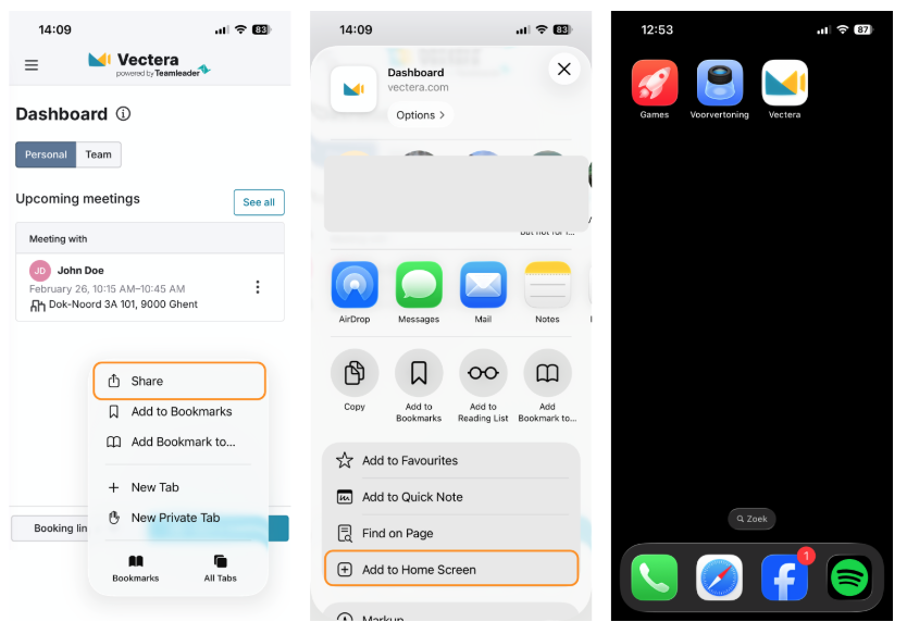 Vectera does not have a mobile app, but in 5 steps you can easily add the Vectera website as an app on your iPhone and create an easy shortcut for yourself. If you have an Android phone, you can check this help article.