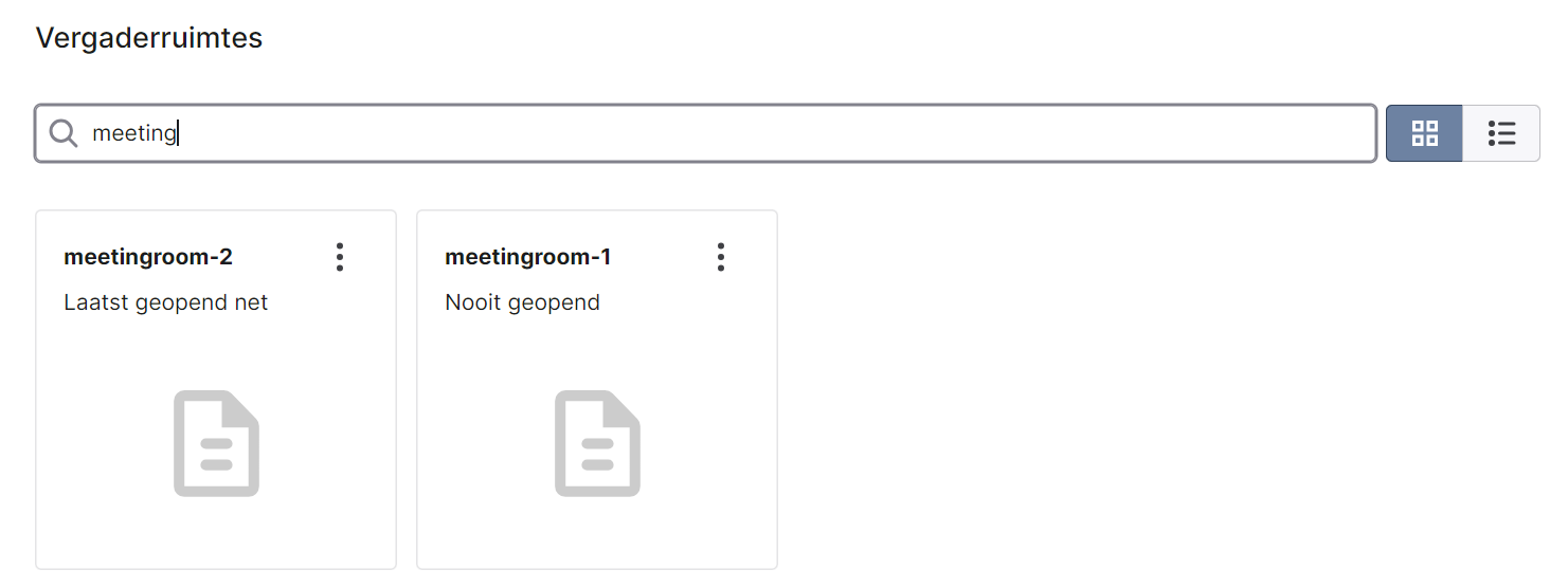 Op de overzichtspagina voor vergaderruimtes kan je gebruik maken van de vergaderruimte filter, de zoekbalk en kan je het weergavetype wijzigen.