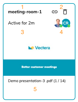 In het bovenstaande voorbeeld zijn meeting-room-1, company-x en jane-doe actieve vergaderruimtes, john-doe is een geopende vergaderruimte en alle andere vergaderruimtes zijn niet actief of geopend. Deze vergaderruimtes worden gerangschikt op basis van laatst aangemaakt of laatst geopend.