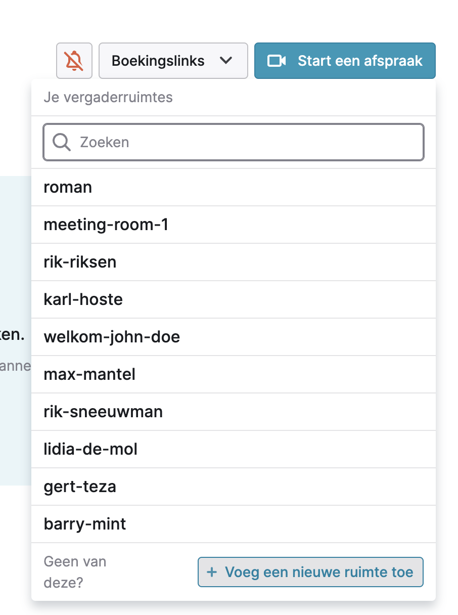 De afsprakenplanner zorgt ervoor dat gasten een afspraak bij jou kunnen inplannen. Als het gaat om een nieuwe klant dan zal er automatisch een vergaderruimte aangemaakt worden op basis van de voor en achternaam van de klant. Meer info vind je in ons afsprakenplanning help centrum!