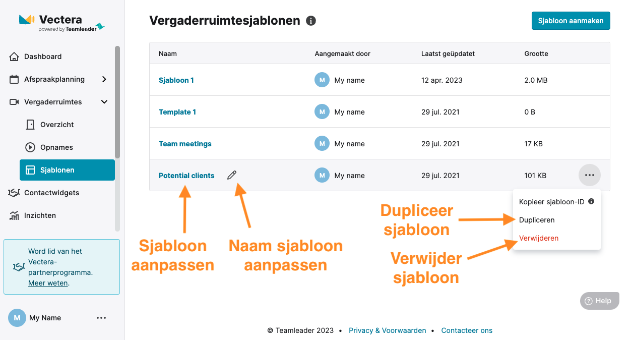 Indien je nog vragen hebt over vergaderruimte sjablonen, neem dan zeker contact op met support@vectera.com.