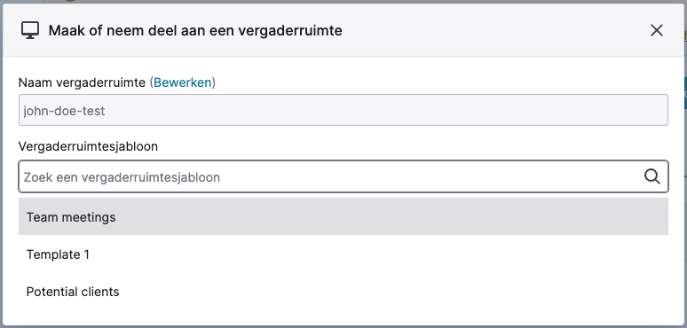 Als je een of meerdere sjablonen hebt aangemaakt, dan kan je een vergaderruimte aanmaken in het dashboard of de sjablonen pagina en een sjabloon selecteren.