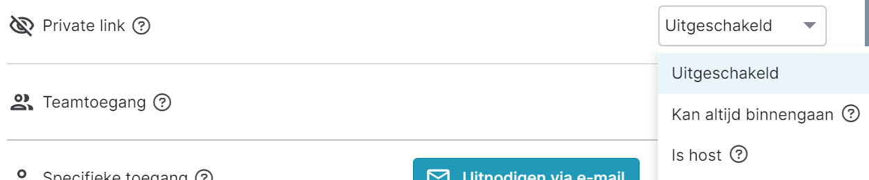 Je kan er ook voor kiezen om een vergaderruimte gesloten te houden en iemand specifieke toegang te geven via een private link. Standaard staat er naast Private link: Uitgeschakeld. Dit wil zeggen dat er geen link gemaakt wordt. Klik op 'Uitgeschakeld' en selecteer één van de andere opties om de vergaderruimte-URL te delen. Je kan uit volgende opties kiezen: