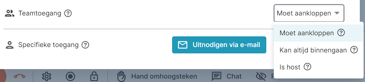 Naast het toekennen van deelopties voor gasten, kan je ook teamleden toegang geven tot een vergaderruimte. Standaard zal 'Teamtoegang' als 'Moet aankloppen' tonen. Dit betekent dat men zal moeten aankloppen alvorens binnen te kunnen. Je kan de standaardinstelling aanpassen in de teaminstellingen en je kan de status ook aanpassen per vergaderruimte.