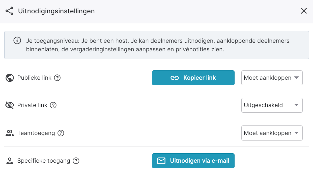 Is host: iemand met de private link kan de vergaderruimte binnen gaan zonder aankloppen en heeft dezelfde rechten als de eigenaar van de vergaderruimte.