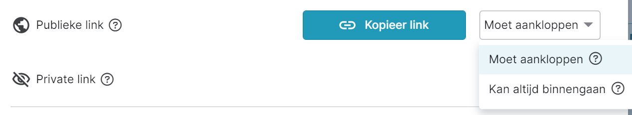 Naast de 'Kopieer link'-knop, kies je of de vergaderruimte gesloten is (= Moet aankloppen) of de vergaderruimte open is voor iedereen die de link heeft ( = Kan altijd binnengaan)