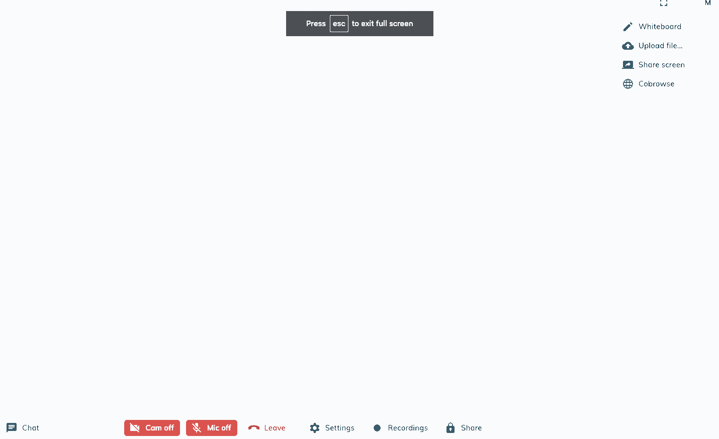 Als je reeds in 'full screen mode' bent en share screen of cobrowse wil starten, zal het volledig scherm gesloten worden. Na het opstarten van Share screen of cobrowse kan je wel opnieuw het volledig scherm activeren.