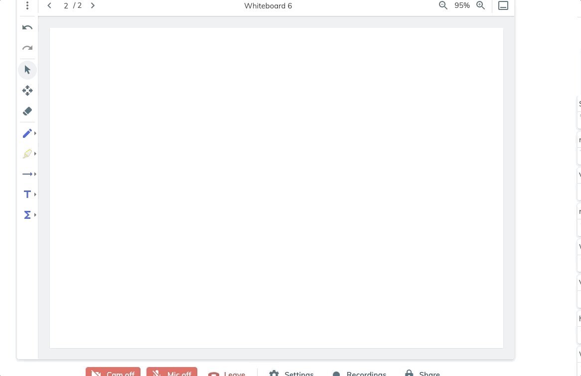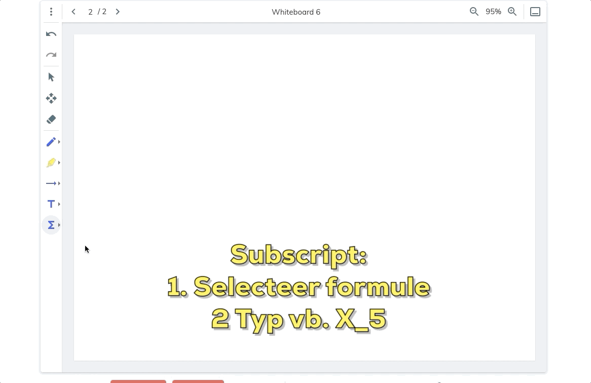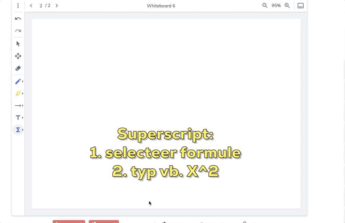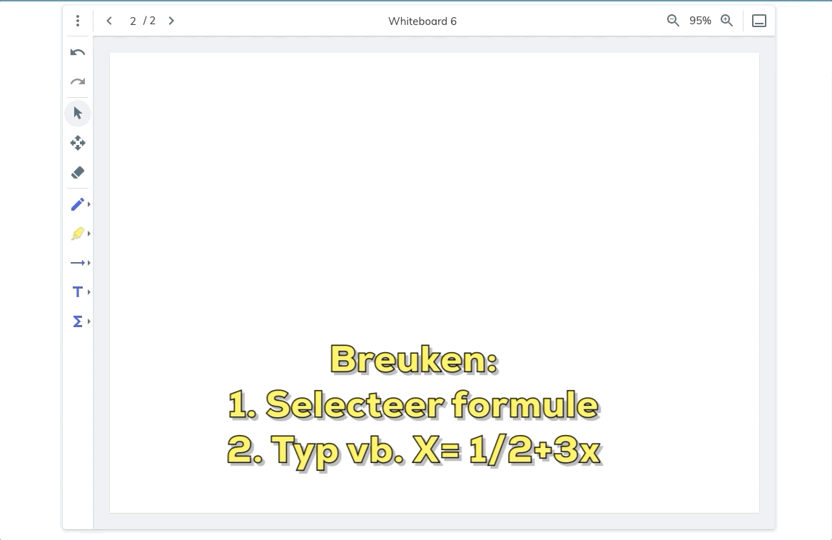 Om een formule toe te voegen, klik je op het som teken ( Σ = sigma) links van het whiteboard en daarna klik je in het whiteboard. Dan kan je de formule uittypen.