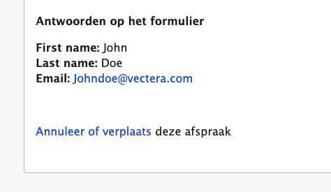 Als ze op Afspraak annuleren klikken en bevestigen, wordt de afspraak geannuleerd en ontvang je een annulerings-e-mail.