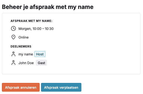 In de bevestigings-e-mail van de geboekte gast zien ze onderaan de mail een optie om de Afspraak te annuleren of te verplaatsen.