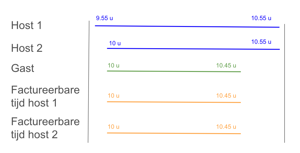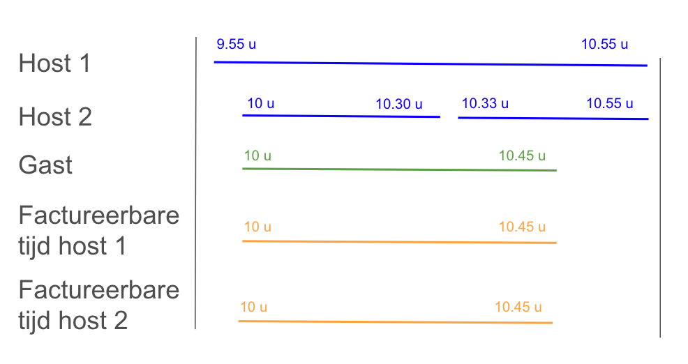 In dit geval doet host 1 de volledige vergadering en host 2 slechts een half uur. Dit betekent dat host 1 een factureerbare tijd van 45 minuten heeft en host 2 een factureerbare tijd van 30 minuten.