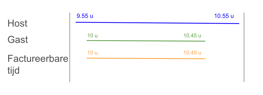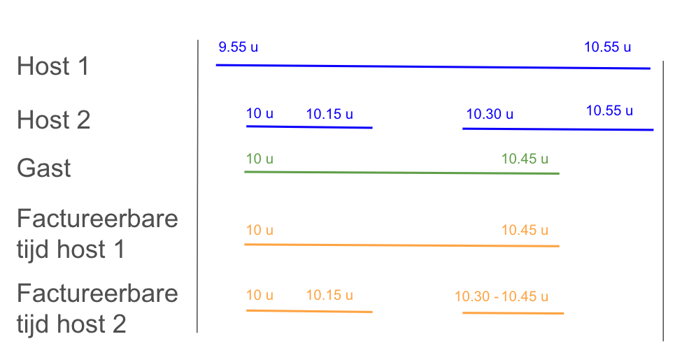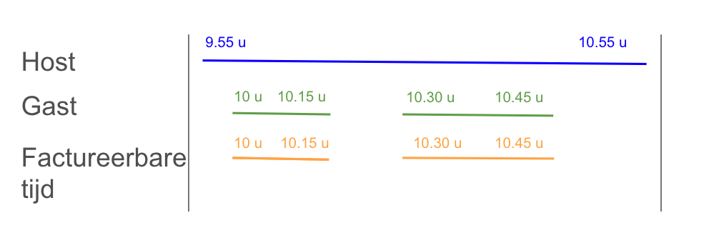 Voorbeeld: De host komt om 9.55 uur de vergaderruimte binnen, de gast komt om 10.00 uur de vergaderruimte binnen. De gast verlaat de vergaderruimte om 10.45 uur, maar de host blijft nog 10 minuten. In dit geval is de factureerbare tijd 45 minuten (10.00 tot 10.45 uur).