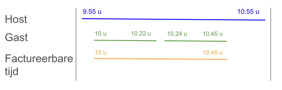 Dit is de situatie die we hebben laten zien in de 'Basisprincipes van tijdregistratie'. De factureerbare tijd is de duur waarin zowel de host als de gast in de vergaderruimte waren. In het onderstaande voorbeeld is de factureerbare tijd 45 minuten.