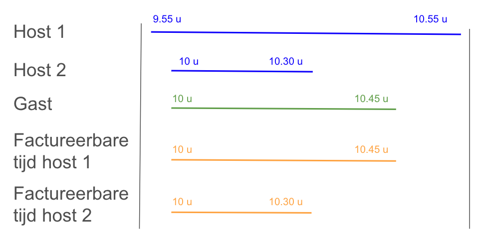 In de onderstaande situaties nemen bv. 2 accountants deel aan een vergadering met 1 klant. In deze situaties zal een van de hosts op een bepaald moment vertrekken, wat invloed zal hebben op de factureerbare tijden.
